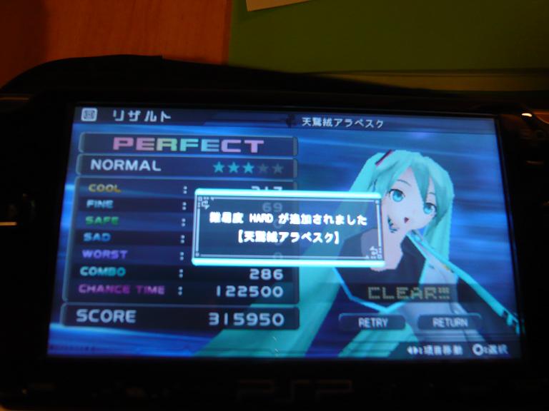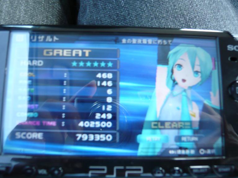 ……のですが、迎えに来てもらった私に渡されたのは一台のPSP。 緋彗「なに? これ?」 友人「君にはこのゲームをクリアしてもらいます。音ゲー得意でしょ?」 このゲーム ⇒ 初音ミク -Project DIVA- 見た目はパラッパラッパーみたいなゲームですね。 曰く、全曲のNORMAL, HARDの譜面でGREAT以上の評価を出せ、と。 物にもよりますが、GREAT以上を出すことで隠し要素が解放されるみたいですね。 こんな感じで、NORMAL譜面でGREATかPERFECT(フルコンボ)評価を出すとHARD譜面が解禁されたり。 で、結果から言いますと。 無事に全曲達成することが出来ました! 粉っちからは『こんなもん作業っしょwww』とか言われたけど疲れたよ!w しかし、なかなかPERFECTは出ませんね。 全曲NORMAL, HARD譜面(約70譜面)を埋める中で達成できたのは、画像を含めて5譜面程度。 難度としてはIIDXでPERFECT狙うのと変わらない感じ。 以下、思ったこととか攻略メモ(?)とか。 ・判定が全体的に遅めなイメージ。 重なる! と思ったタイミングで早めに押してしまうとコンボが途切れやすかった。 どちらかというと遅めのタイミングに対して甘い気がしたので、リズムがわかりにくくて不安な箇所は、重なったのを見てから押す、くらいでも良いかも。 ・連打は滅茶苦茶に押さない ゆっくりしっかり正確に。 早く押して回数が多くなるよりは、ゆっくり目に押して不足するほうが痛手は少ない。 ・音符の配置間隔を意識 小節線がないので、音符の間隔のみで押すタイミングを判断する必要有り。 隣り合っていたら8分、重なっていたら16分というのを、予告が出たときから意識できると楽。 記憶の限りだと、3連符は「いのちの歌」と「金の聖夜霜雪に朽ちて」くらいしかなかったかと。 ・PERFECTを出さなければ隠し要素が解放されない、といったことがないのは良心的ですねw ・曲リストの一番上が「ワールドイズマイン」というのはちょっと微妙かも。 曲としてはノリやすくていいけど、譜面難度が高くて初心者向きではないかなぁ。 もっとゆっくりな曲で導入させたほうが良かったのでは。 ・結局、チャンスタイムゲーとなっているのが残念。 GREAT評価を出すためには、他がどれだけ出来ていても、チャンスタイム(コンボつなぐと高得点になる譜面地帯)でミスをすると致命的なのが痛い。 大体チャンスタイムは曲の後半に配置されているので、ここだけのために繰り返してプレイするのは辛いかな、といった印象。 ・1曲が長いw(IIDXに比べると) ・ミクかわいいよ、かわいいよミク いろいろ書いたけど、全体的に完成度も高くて楽しいゲームでした。 中途半端に終わってたら、本体ごと買っていたかもしれん……。 ミク、恐ろしい娘!w 最後に、最高難度の2曲のリザルト画面を。 「金の聖夜霜雪に朽ちて」☆6 間奏が鬼畜。△ボタンが重なる密集地帯は、変に表示に惑わされずに8分間隔で押していれば抜けられるかな、といった感じ。 抜けた後のチャンスタイムが繋ぎやすいのが救いかな。 フルコンボ難度は間違いなく最高。 「初音ミクの消失」☆7 難度表記最高。先ずはBPMの速さとリズムの取りにくい曲調に面食らうw けど、リズムさえわかってしまえば譜面自体は単調なので、やればやるほどミス数が減っていくと思います。(聖夜は無理だけど、こっちならフルコン狙えそう) 3連打や7連打などが多いけど、あわてず騒がず正確に押せばクリアが近い? PR